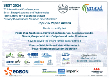 Este es un certificado otorgado como parte del SEST 2024 (7th International Conference on Smart Energy Systems and Technologies), un congreso internacional enfocado en sistemas y tecnologías de energía inteligente. El premio, titulado "Top 2% Paper Award", se otorga a los artículos científicos que están clasificados entre el 2% de los mejores trabajos presentados en esta conferencia.