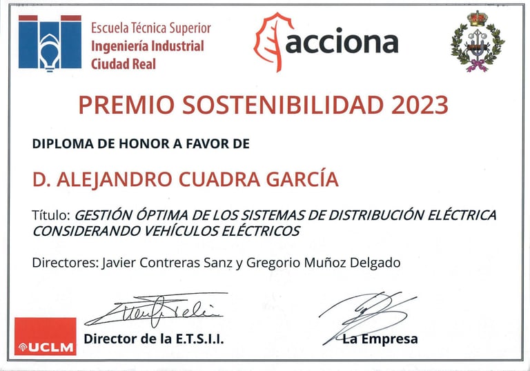 Este es el Premio Sostenibilidad 2023, un reconocimiento otorgado por la Escuela Técnica Superior de Ingeniería Industrial de Ciudad Real (ETSII) en colaboración con Acciona, una empresa líder en sostenibilidad y energías renovables. El diploma se me otorga por el trabajo titulado: