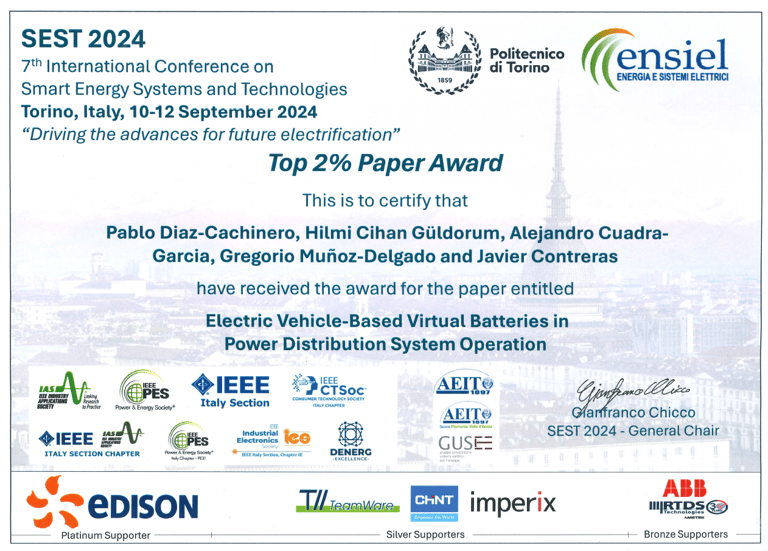 El reconocimiento certifica que el artículo titulado "Electric Vehicle-Based Virtual Batteries in Power Distribution System Operation" (Baterías Virtuales Basadas en Vehículos Eléctricos para la Operación de Sistemas de Distribución de Energía) ha sido destacado por su excelencia técnica, impacto y relevancia dentro de la temática del congreso, que este año se centró en "Driving the advances for future electrification" (Impulsando los avances para la electrificación futura).